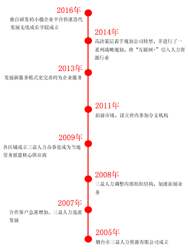 2008年8月,鄄城縣三益人力資源開發(fā)有限公司正式成立,鄄城公司的成立為公司今后的發(fā)展發(fā)揮重要作用。煙臺三益人力資源有限公司總部于2009年07月06日在煙臺工商局注冊成立。在公司發(fā)展壯大的10年里,我們始終為客戶提供好的產品和技術支持、健全的售后服務。公司先后在三十里堡、科信大廈、業(yè)達智慧谷、天宇市場開設了店鋪。2017年3月,三益威海分公司成立,大大拓寬了我們的國內市場。